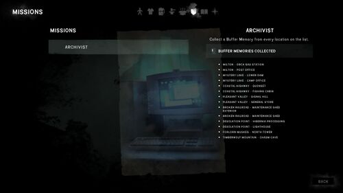 In this challenge, the player must view a Buffer Memory at each location listed in the journal. Each location will have a computer, which will turn on and display buffer memories during an Aurora.
