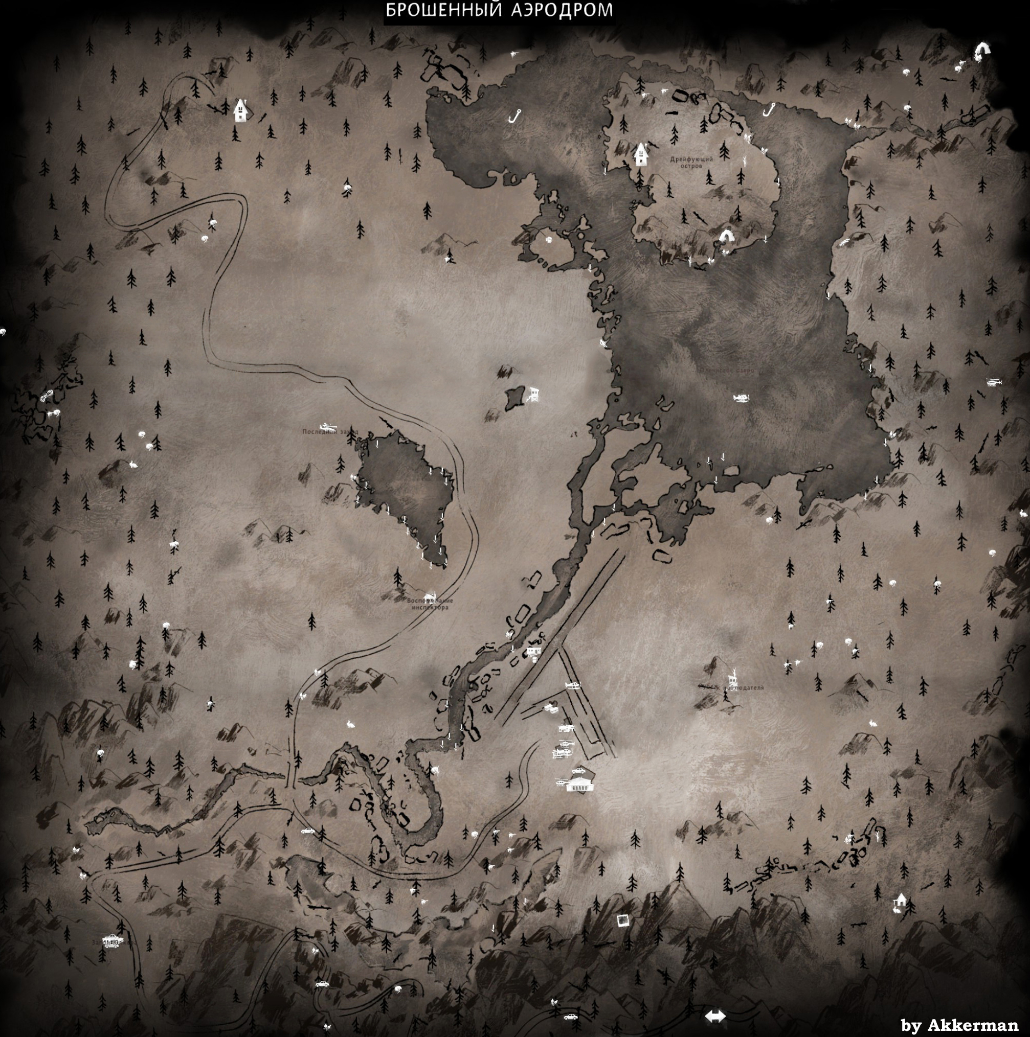 The forsaken airfield map with icons for all locations and valuable items. Created by Alana Akkerman.