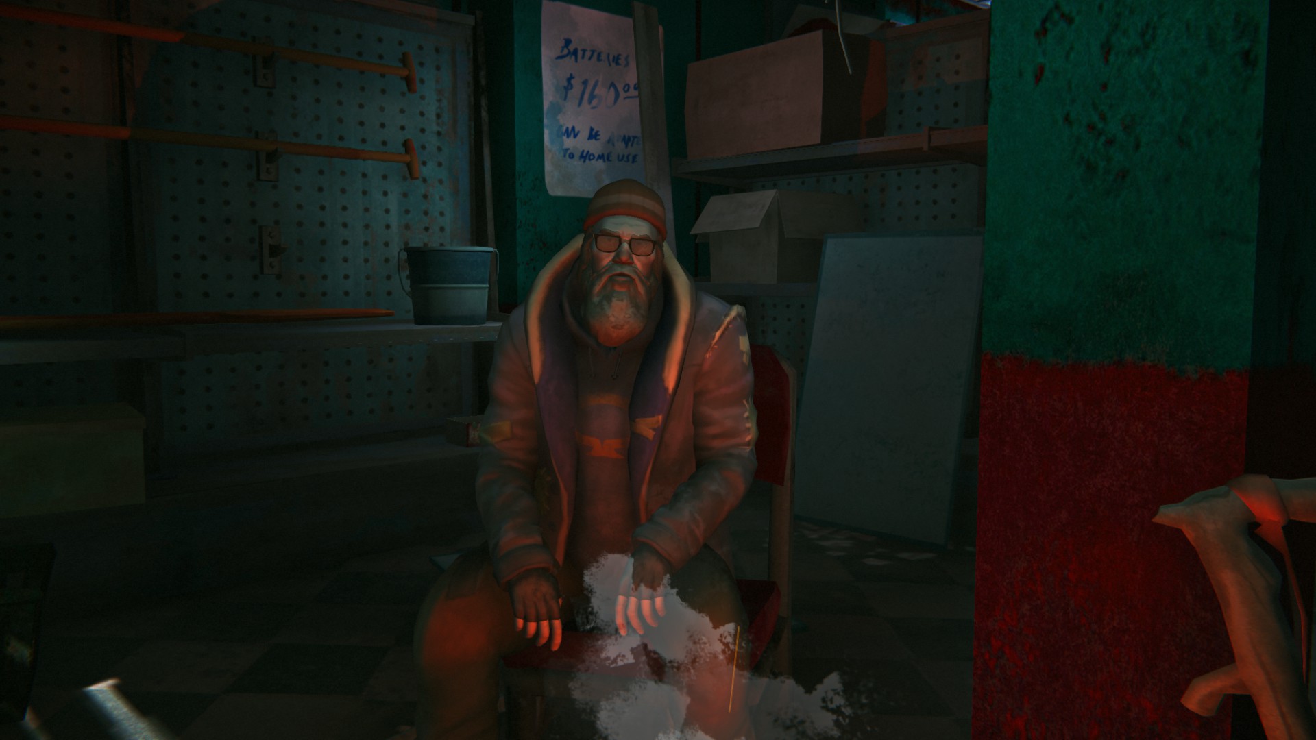 Methuselah sitting by the fire outside the Carter Hydro Dam in story mode.