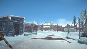 There is a gatehouse with a door along the road in front of the cannery. It may be a good place for players to fight timberwolves with firearms.