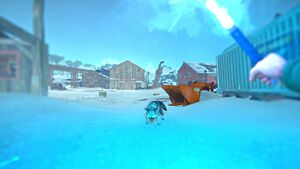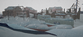 - Near a group of barrels buried in the snow, right up against a pile of turned over industrial bins (green crates are nearby for reference)