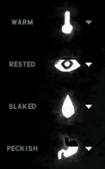 Warmth, Fatigue, Thirst, and Hunger represent Needs that must be satisfied during the course of the game.