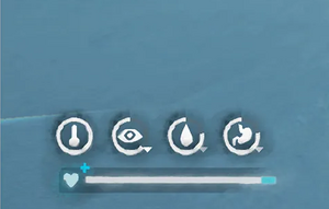 The four Needs are displayed on the Survival Overlay as white circular meters (formerly shaped like icons representing each Need). Satisfaction of a Need fills its respective meter. Arrows beside the bar indicate the direction and rate of progression; the more arrows in one direction, the faster the movement in that direction is.