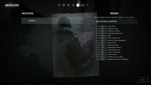 The Nomad challenge is one of eight challenges in the Long Dark. It requires the player to spend three entire days in each location listed in their journal. The locations are not located in any one region, but are scattered between the many different regions, spanning the world. The game difficulty is Voyageur.